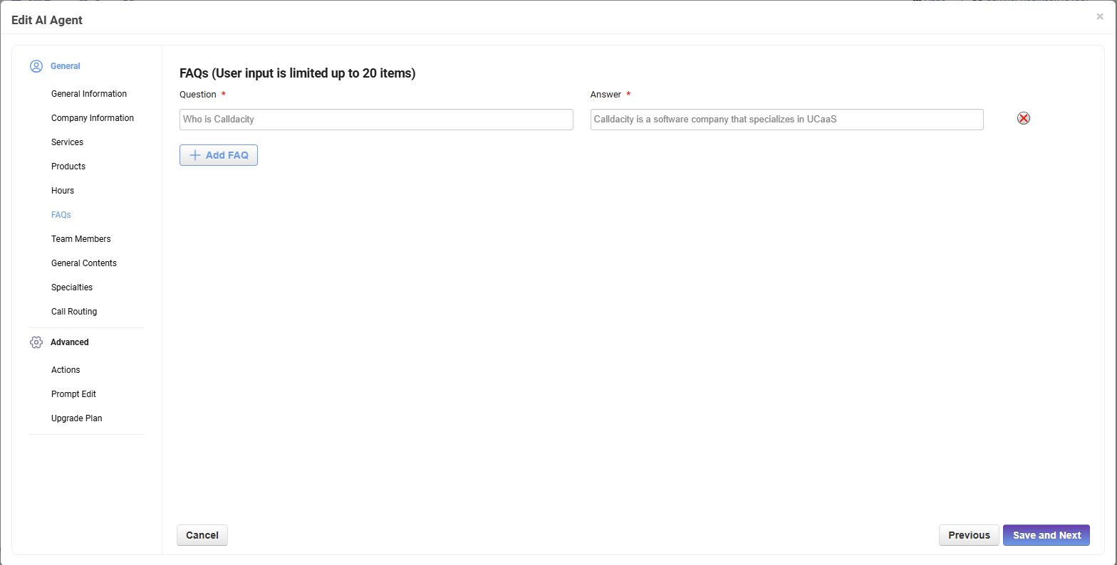 If you need more than 20 FAQs you may need a Knowledgebase for your Agent. Contact your sales representative to get a knowledgebase configured.