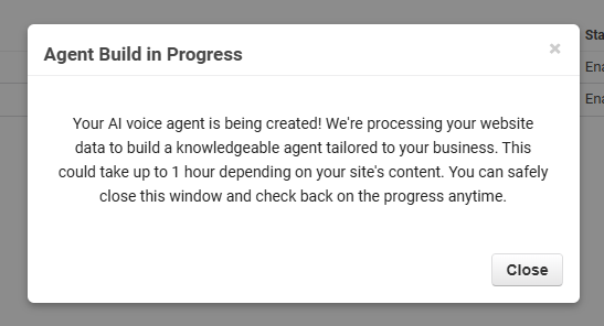3. After clicking "Next," our intelligent system will scan your website to build your agent's knowledge automatically. Building agents depends on how large your website so check back periodically to see the progress.
