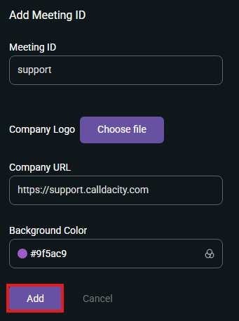 6. Enter in your desired meeting ID and optional white-label information and click "Add":