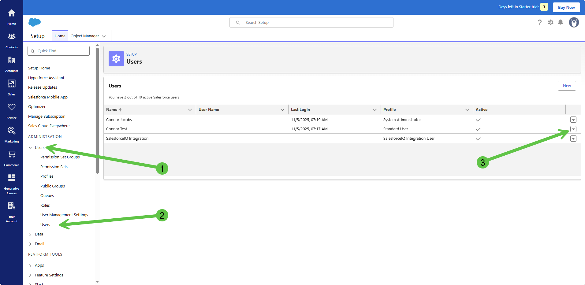 b. Go to Users under "Administration" column and go to "Users" then select the drop-down arrow to the right of the specific user
