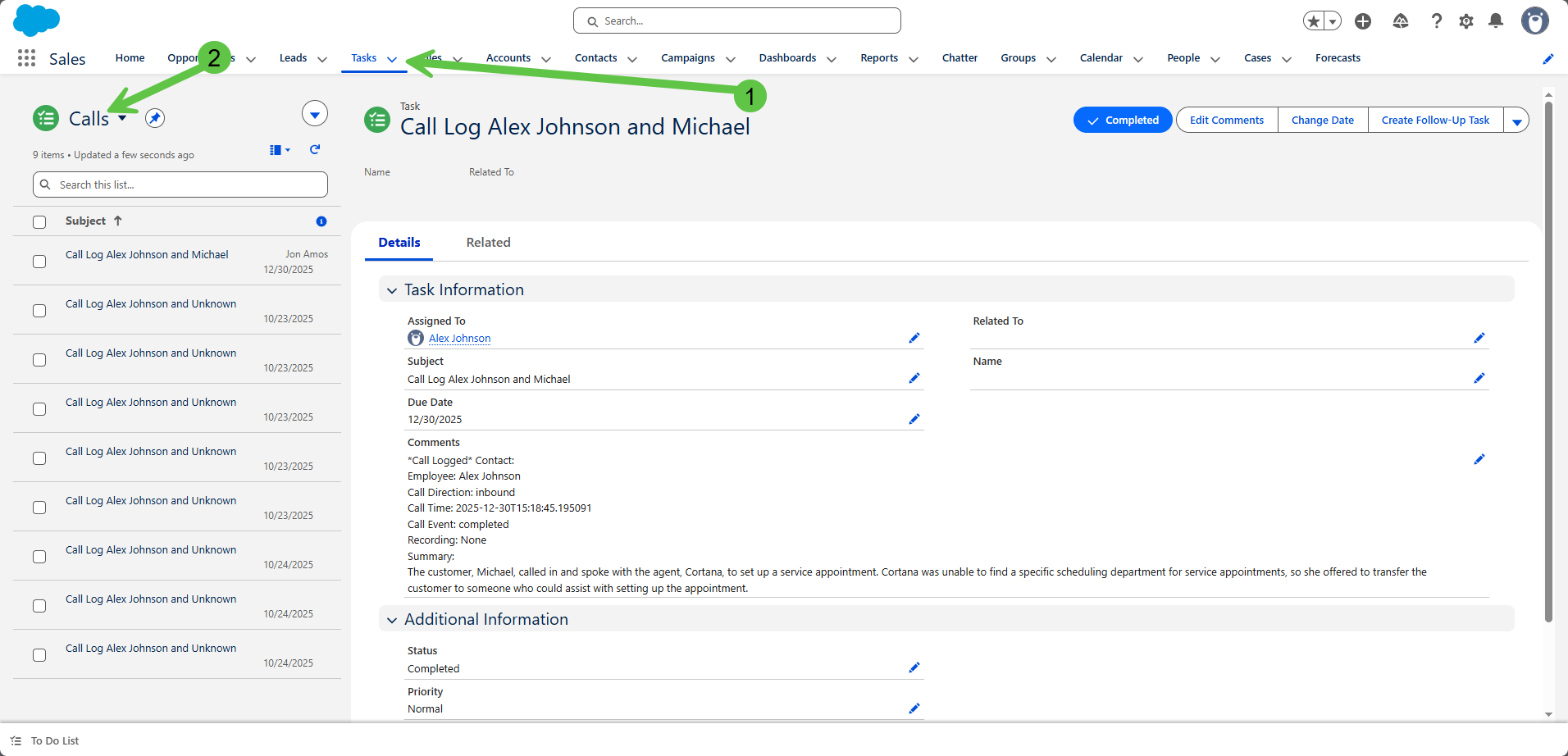 Step 8: Navigate to Tasks and Search for Calls View