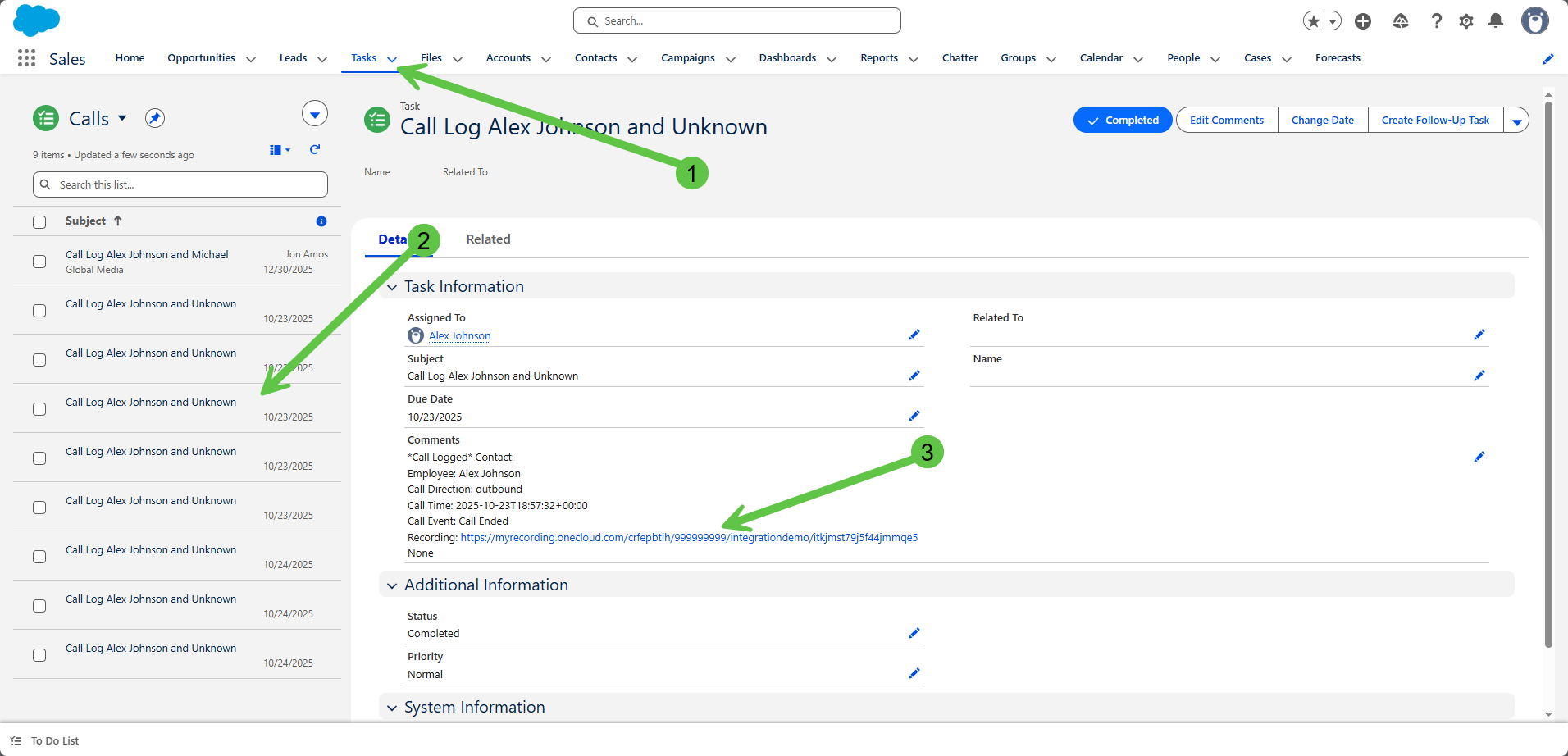 Go to Tasks > Select the Designated Call Record > Click the Recording Link in the Comments