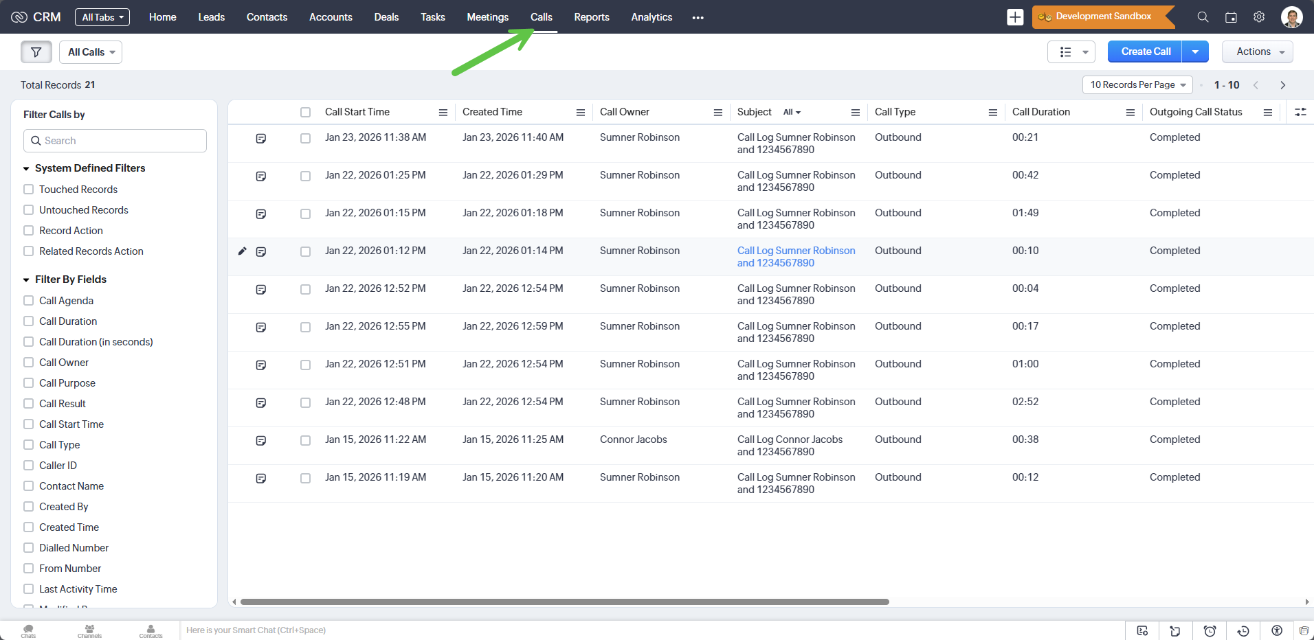 Example of a Call's Data being Logged under the Calls Tab: