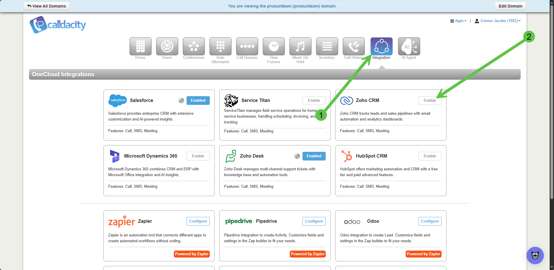 2. Go to the "Integration" Tab and Select on the "Enable" Button within the Zoho CRM Box